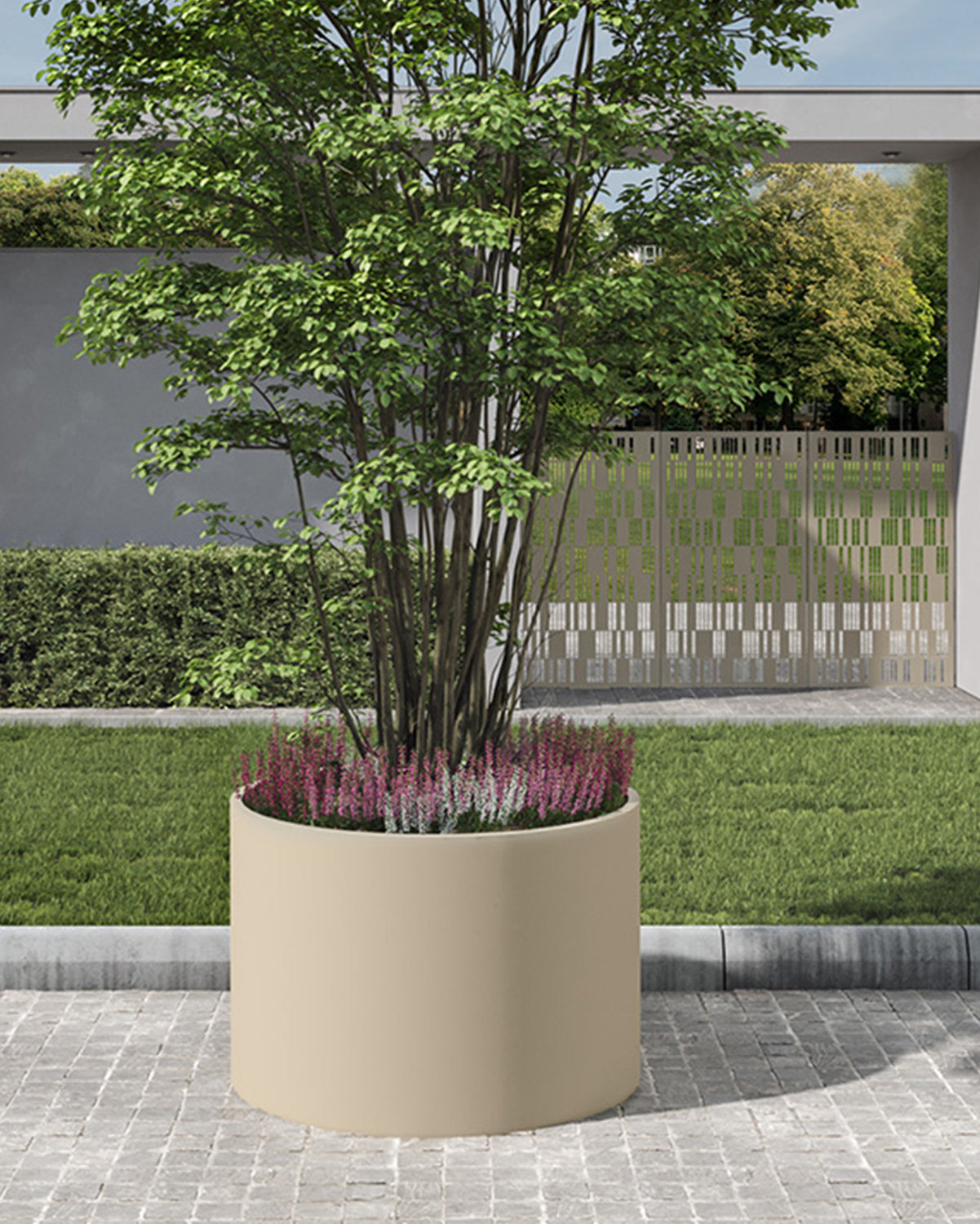 The ISOLA planters are elegant, round containers made of high-quality aluminum, powder-coated in long-lasting architectural colors. They are available in various sizes and are designed either with a welded seal for indoor use or with an integrated overflow for outdoor use.