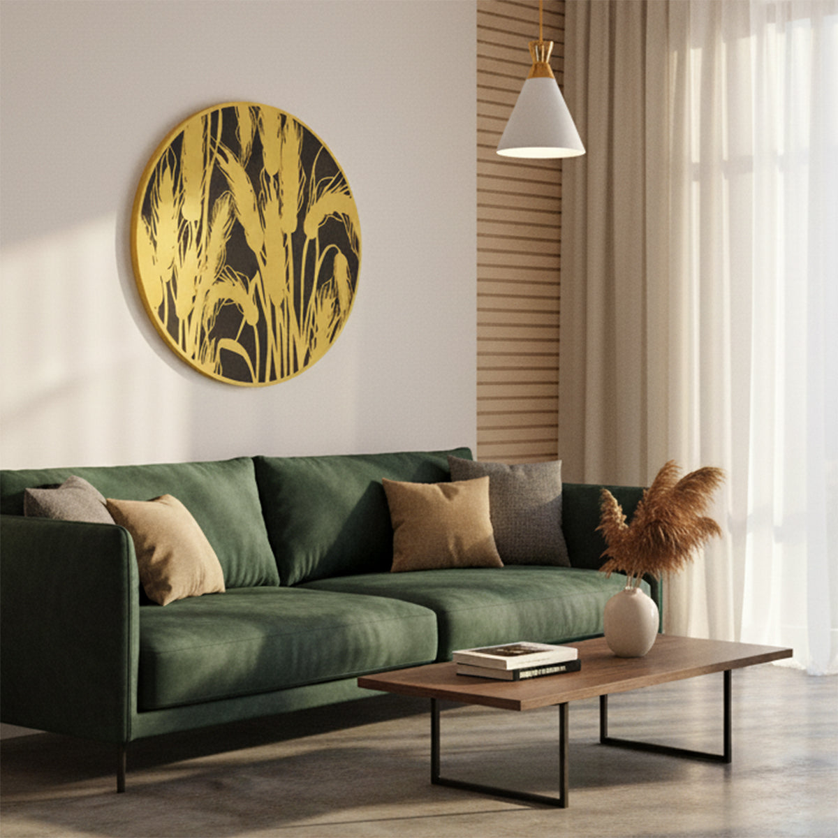 Das runde Metallwandbild WEIZEN vereint natürliche Eleganz und modernes Design. Das filigrane Weizenmotiv wird präzise mit Lasertechnik aus hochwertigem Metall geschnitten und in der edlen Farbe Gold pulverbeschichtet, wodurch es einen luxuriösen Akzent in jedem Raum setzt.