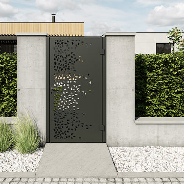 Aluminum garden gate with a shaped tube frame and laser-cut panel