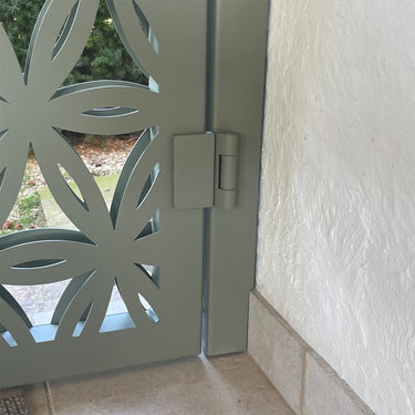 Aluminum garden gate with a shaped tube frame and laser-cut panels